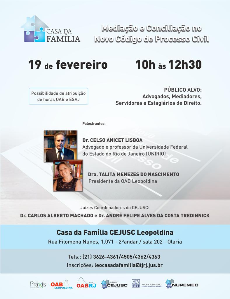 A Casa da Família da Leopoldina e a Práxis Sistêmica convidam para palestra “Mediação e Conciliação no Novo Código de Processo Civil”, que será ministrada pelo professor Celso Anicet Lisboa e Dra. Talita Menezes do Nascimento. Dia 19 de fevereiro de 2019, às 10h no CEJUSC do Fórum Regional da Leopoldina.