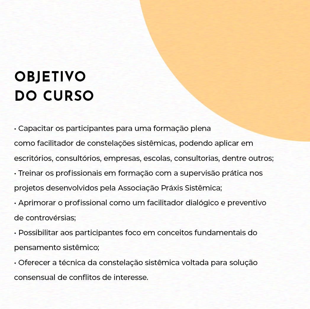 – Capacitar os participantes para uma formação plena como facilitador de constelações sistêmicas, podendo aplicar em escritórios, consultórios, empresas, escolas, consultorias, dentre outros;