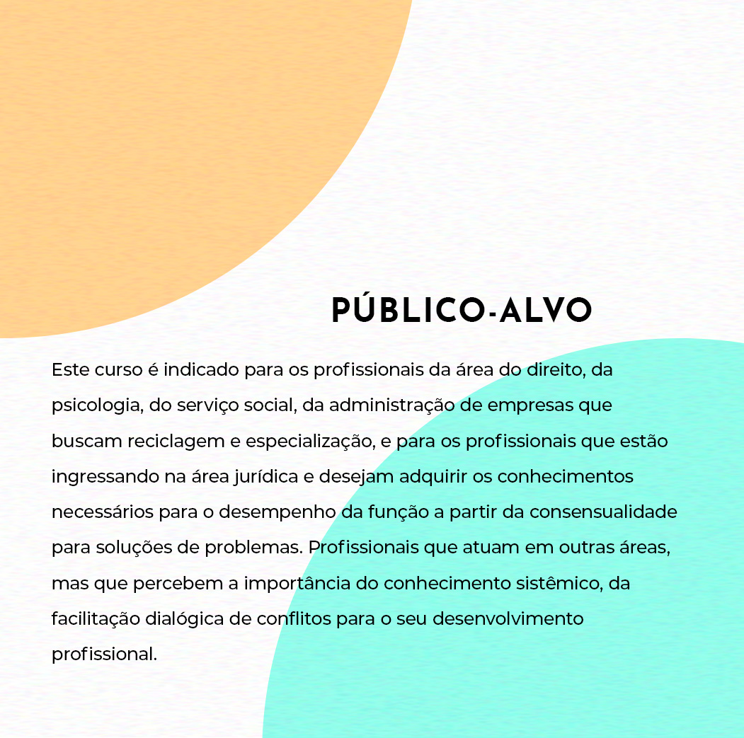 Este curso é indicado para os profissionais da área do direito, da psicologia, do serviço social, da administração de empresas que buscam reciclagem e especialização, e para os profissionais que estão ingressando na área jurídica e desejam adquirir os conhecimentos necessários para o desempenho da função a partir da consensualidade para soluções de problemas. Profissionais que atuam em outras áreas, mas que percebem a importância do conhecimento sistêmico, da facilitação dialógica de conflitos para o seu desenvolvimento profissional.