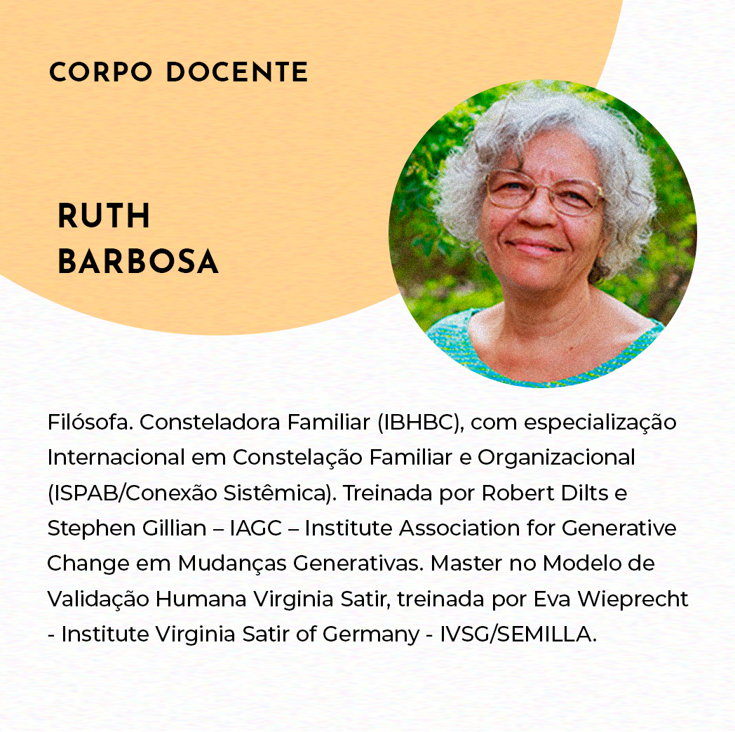 RUTH BARBOSA – Filósofa. Consteladora Familiar (IBHBC), com especialização Internacional em Constelação Familiar e Organizacional (ISPAB/Conexão Sistêmica). Treinada por Robert Dilts e Stephen Gillian – IAGC – Institute Association for Generative Change em Mudanças Generativas. Master no Modelo de Validação Humana Virginia Satir, treinada por Eva Wieprecht – Institute Virginia Satir of Germany – IVSG/SEMILLA.