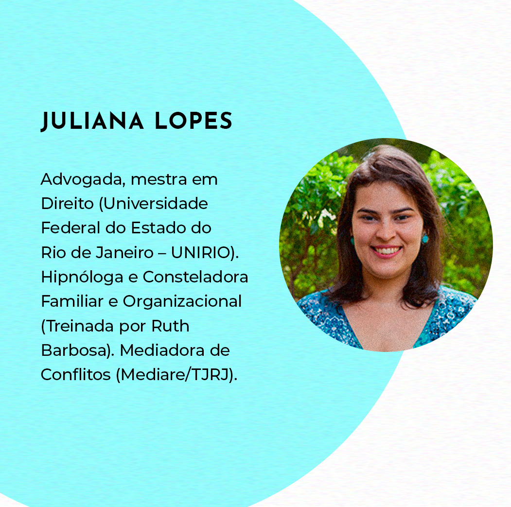 JULIANA LOPES – Advogada, mestra em Direito (Universidade Federal do Estado do Rio de Janeiro – UNIRIO). Hipnóloga e Consteladora Familiar e Organizacional (Treinada por Ruth Barbosa). Mediadora de Conflitos (Mediare/TJRJ).