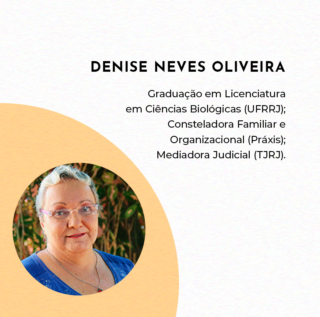 DENISE NEVES OLIVEIRA – Graduação em Licenciatura em Ciências Biológicas (UFRRJ); Consteladora Familiar e Organizacional (Práxis Sistêmica); Mediadora Judicial (TJRJ).