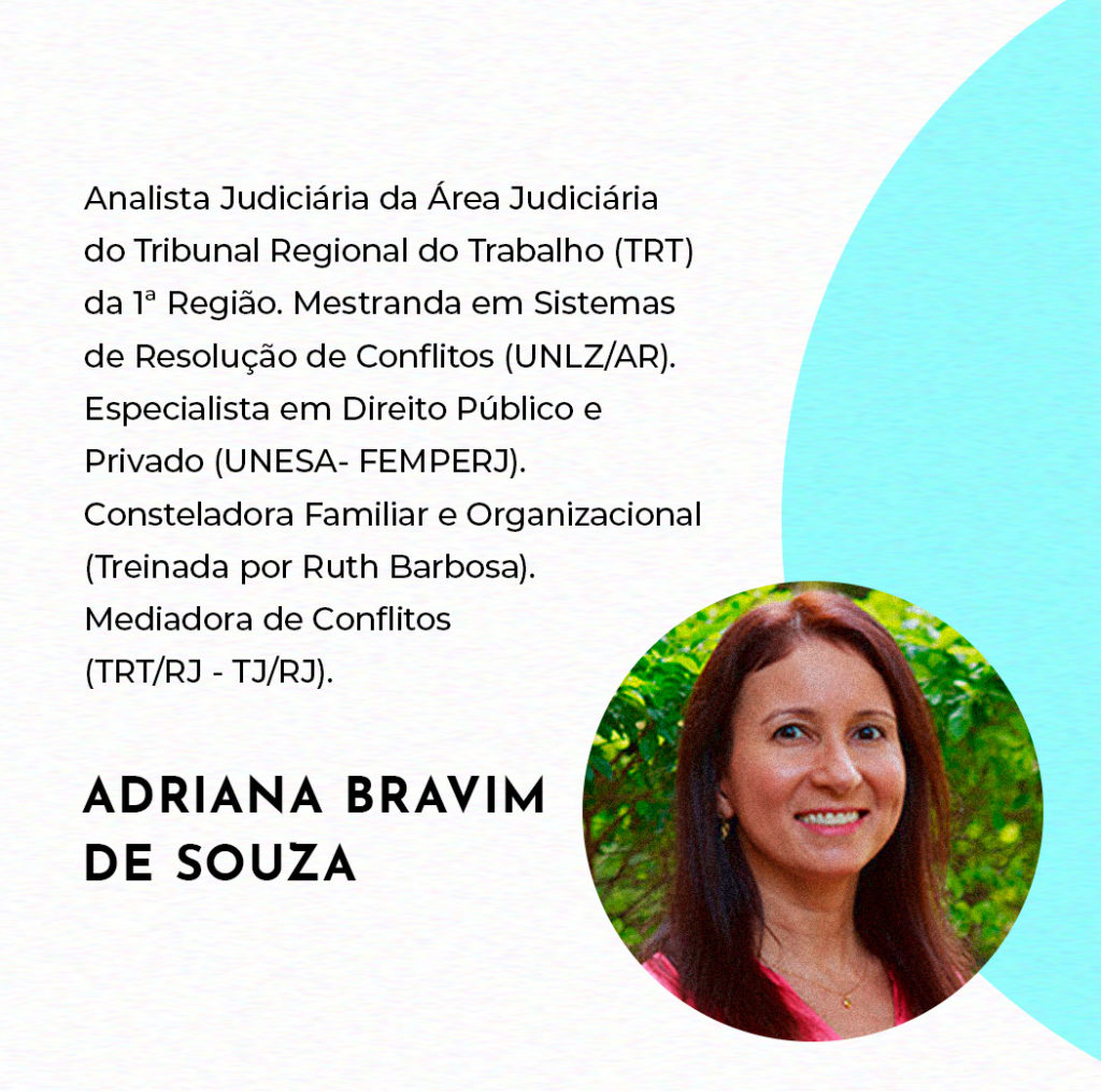 ADRIANA BRAVIM DE SOUZA – Analista Judiciária da Área Judiciária do Tribunal Regional do Trabalho (TRT) da 1ª Região. Mestranda em Sistemas de Resolução de Conflitos (UNLZ/AR). Especialista em Direito Público e Privado (UNESA – FEMPERJ). Consteladora Familiar e Organizacional (Treinada por Ruth Barbosa). Mediadora de Conflitos (TRT/RJ).