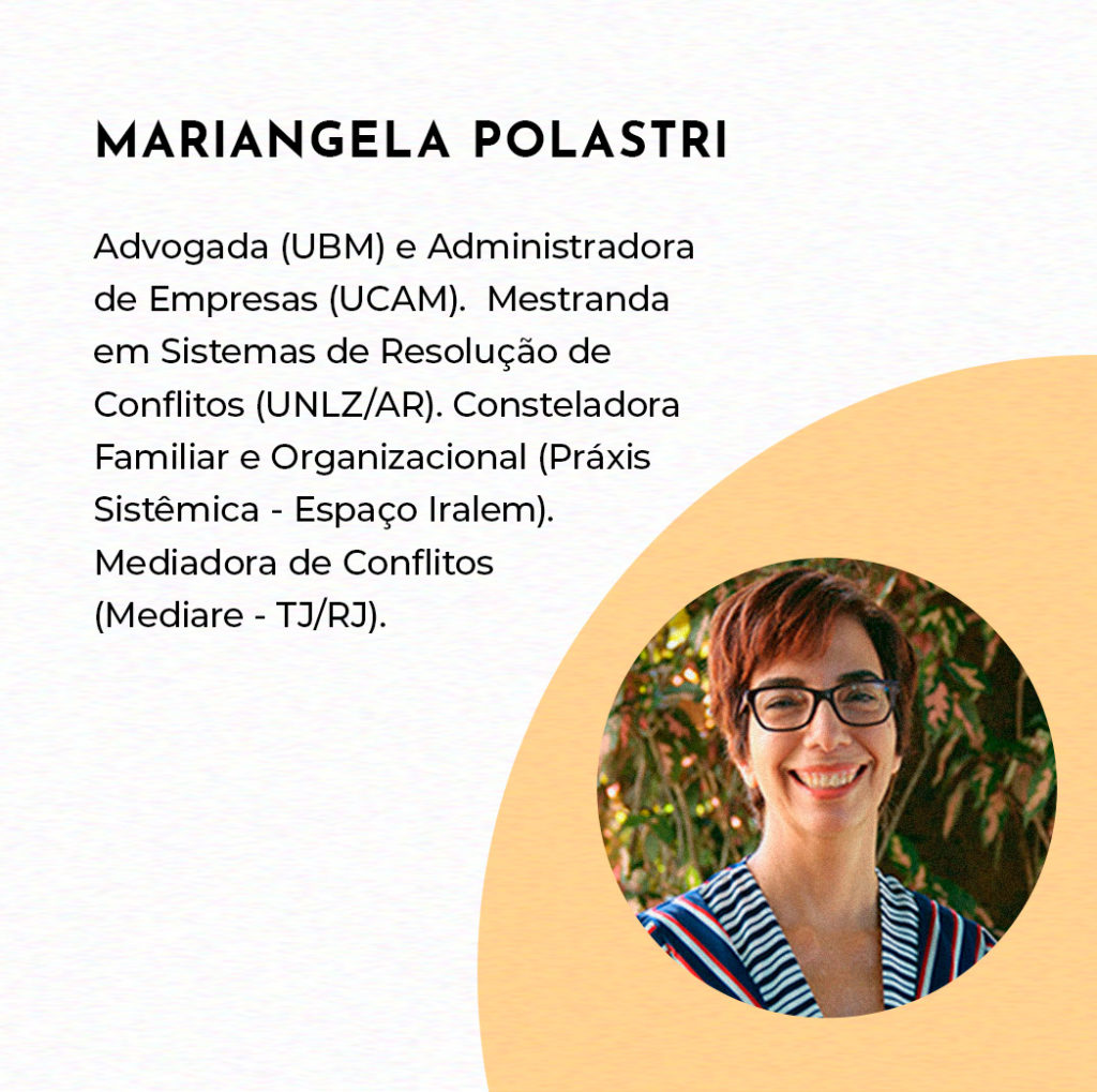 MARIANGELA POLASTRI – Advogada (UBM) e Administradora de Empresas (UCAM). Mestranda em Sistemas de Resolução de Conflitos (UNLZ/AR). Consteladora Familiar e Organizacional (Práxis Sistêmica – Espaço Iralem). Mediadora de Conflitos (Mediare – TJ/RJ).